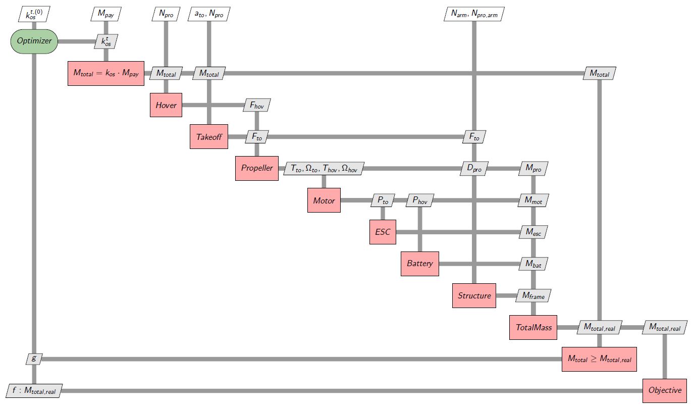 It consists in addition an oversizing coefficent \(k_{os} \quad [1-10]\) as a design variable and additional inequality constraint \(M_{total} \geq M_{total,real}\). This way, we make sure that the drone is capable of lifting the load and itself. As we are minimizing the total mass \(M_{total,real}\) the oversizing coefficient \(k_{os}\) will tend to be as small as possible and thus the inequality constraint will be equivalent to an equality constraint (\(M_{total} = M_{total,real}\)). This is one way of solving an algebraic loop, other methods use numerical solvers or other optimizer-based formulations. The formulation of the optimization problem is the following: